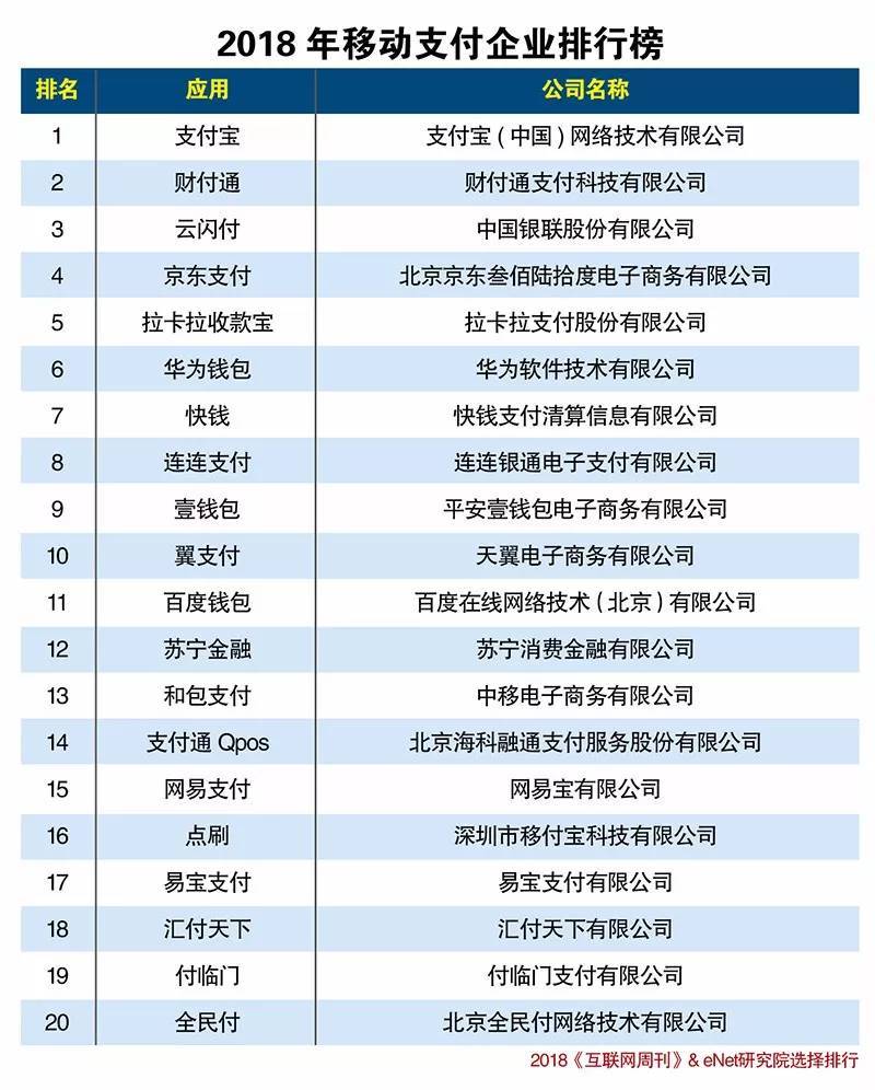 2018年最新中國移動支付企業(yè)排名榜揭曉!
