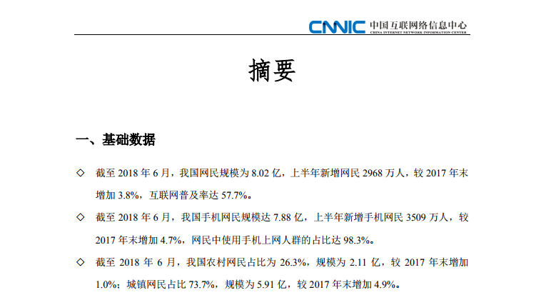 根據(jù)第42次《中國互聯(lián)網(wǎng)絡發(fā)展狀況統(tǒng)計報告》顯示,截止2018年6月,我國網(wǎng)民規(guī)模為8.02億,上半年新增網(wǎng)民2968萬人,較2017年末增加3.8%,互聯(lián)網(wǎng)普及率達57.7%。截止2018年6月,我國手機網(wǎng)民規(guī)模達7.88億,上半年新增手機網(wǎng)民3509萬人,較2017年末增加4.7%,網(wǎng)民中使用手機上網(wǎng)人群的占比達98.3%。截止2018年6月,我國農(nóng)村網(wǎng)民占比為26.3%,規(guī)模為2.11億,較2017年末增加1.0%;城鎮(zhèn)網(wǎng)民占73.7%,規(guī)模為5.91億,較2017年末增加4.9%。