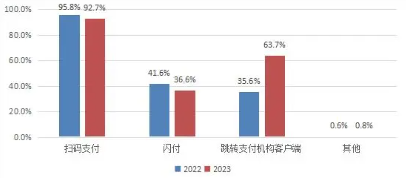其中,用戶支付時選擇跳轉(zhuǎn)支付寶、微信等支付機(jī)構(gòu)客戶端支付,滲透率達(dá)63.7%,較2022年增長28.1個百分點;36.6%的用戶會考慮使銀行卡或Apple Pay、Huawei Pay、Mi Pay等產(chǎn)品的閃付功能支付。