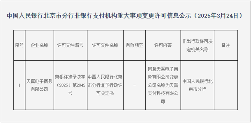 文章來源:四九八網(wǎng)絡(luò)發(fā)布時間:2025-04-07 10:18:56熱度:326近日,人民銀行北京市分行非銀行支付機(jī)構(gòu)重大事項變更許可信息(2025年3月24日)顯示,同意天翼電子商務(wù)有限公司變更公司名稱為天翼支付科技有限公司(簡稱“翼支付”)。