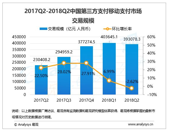 根據(jù)Analysys易觀在今年10月發(fā)布的《中國第三方支付移動支付市場季度監(jiān)測報告2018年第2季度》數(shù)據(jù)顯示,2018年第二季度,中國第三方支付移動支付市場交易規(guī)模達393078.3億元人民幣,環(huán)比略降2.62%,同比增加70.6%。