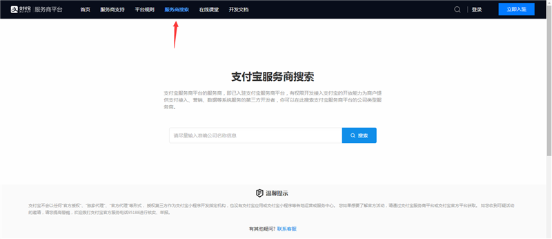 登陸支付寶官方服務商后臺,然后點擊網(wǎng)頁上方的服務商搜索,即可進入支付寶服務商搜索