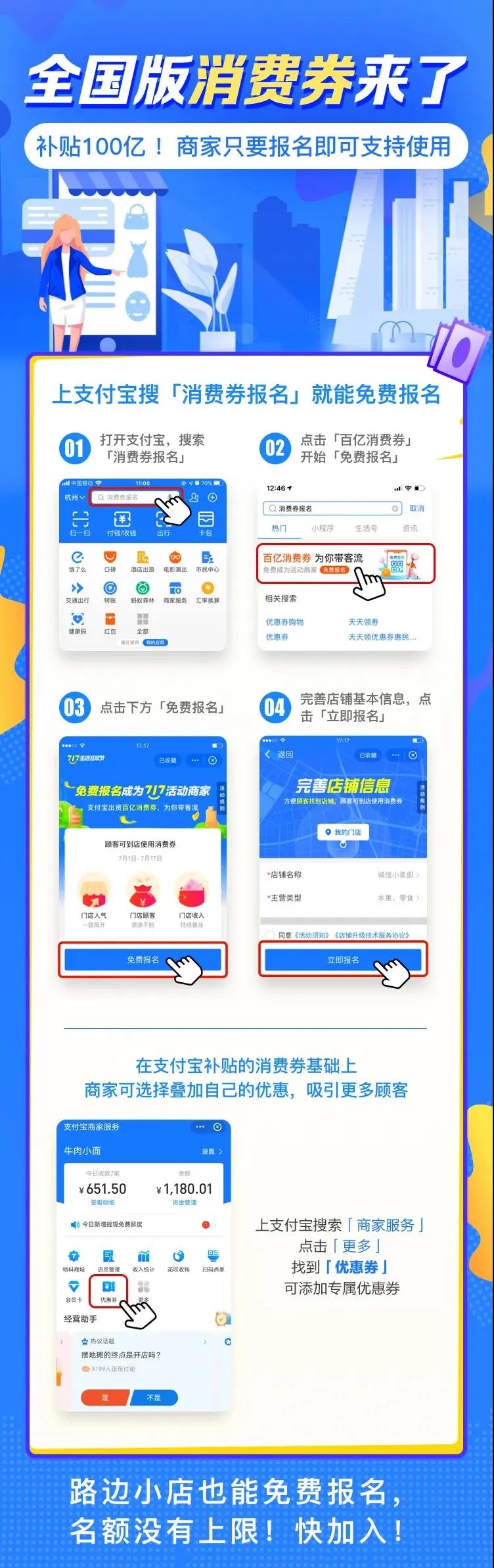 消費(fèi)時(shí)萬一遇到不支持的商家,可請(qǐng)他上支付寶搜「消費(fèi)券報(bào)名」,1分鐘就能完成免費(fèi)報(bào)名,當(dāng)場(chǎng)能用,路邊攤早點(diǎn)鋪等都可參加。