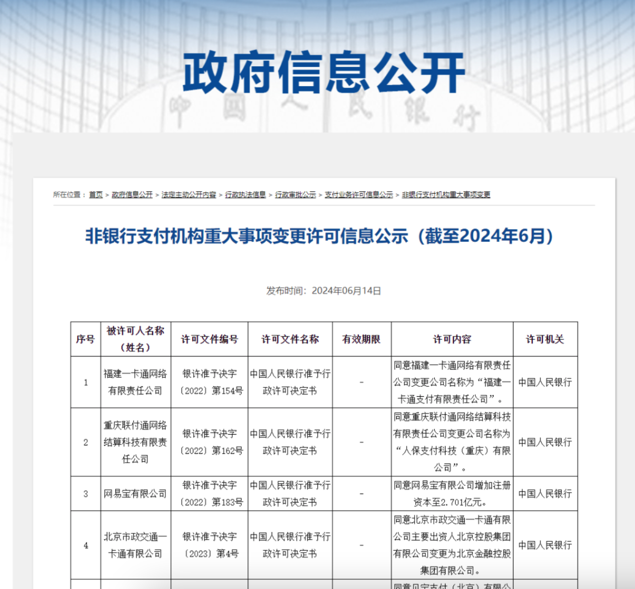 文章來(lái)源:四九八網(wǎng)絡(luò)發(fā)布時(shí)間:2024-06-18 15:06:42熱度:8012024年6月14日,中國(guó)人民銀行“非銀行支付機(jī)構(gòu)重大事項(xiàng)變更許可信息公示”頁(yè)面更新,不少變更許可內(nèi)容為機(jī)構(gòu)名稱變更。