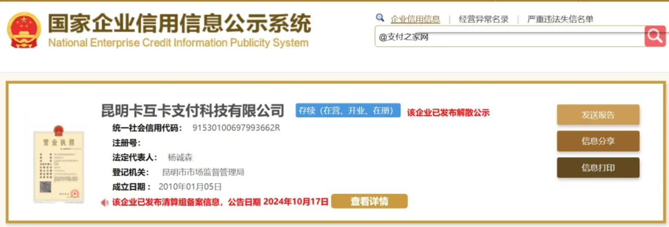 文章來源:四九八網(wǎng)絡(luò)發(fā)布時間:2024-10-28 09:33:35熱度:6042024年10月17日,曾經(jīng)的第三方支付平臺(持牌支付機(jī)構(gòu))昆明卡互卡支付科技有限公司(簡稱"卡互卡支付")廣告顯示,其在昆明市市場監(jiān)督管理局進(jìn)行了“注銷備案”,注銷原因為決議解散。