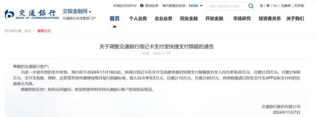 根據(jù)交通銀行發(fā)布的公告,該行將于11月18日起,將該行借記卡在支付寶消費(fèi)場景的快捷支付限額提升至單筆20萬元、日累計(jì)20萬元、月累計(jì)600萬元,支付寶轉(zhuǎn)賬、理財(cái)、還款等其他場景繼續(xù)維持現(xiàn)行限額標(biāo)準(zhǔn),即單筆5萬元、日累計(jì)10萬元、月累計(jì)60萬元。
