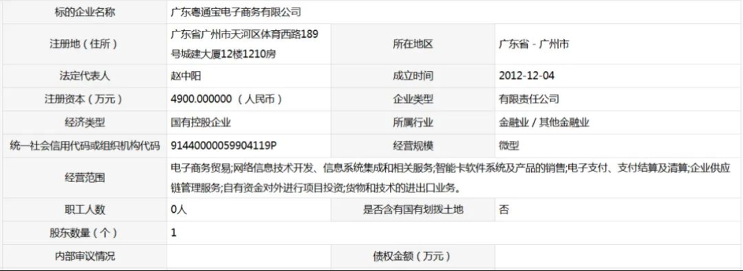 粵通寶原名廣東廣物電子商務有限公司,成立于2015年,同年3月獲中國人民銀行頒發(fā)的《支付業(yè)務許可證》,獲準在廣東省內(nèi)開展預付卡發(fā)行與受理業(yè)務,是當年全國唯一獲批的支付機構(gòu)。2017年11月,該公司更名為“廣東粵通寶”,股權由廣東省廣物控股集團劃轉(zhuǎn)至廣東聯(lián)合電服信息科技有限公司,后者隸屬于廣東省交通集團。