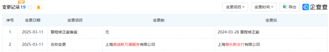 文章來(lái)源:四九八網(wǎng)絡(luò)發(fā)布時(shí)間:2025-03-19 14:14:48熱度:448近日,企查查顯示,上海索迪斯萬(wàn)通服務(wù)有限公司的企業(yè)名稱已變更為“上海普樂(lè)斯支付有限公司”。