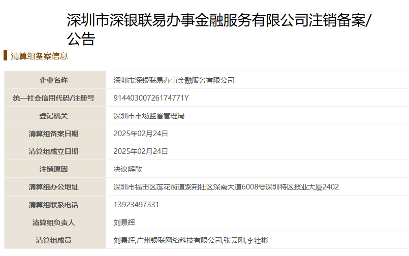 文章來(lái)源:四九八網(wǎng)絡(luò)發(fā)布時(shí)間:2025-03-20 08:57:54熱度:369債權(quán)人公告信息顯示,2025年02月24日,深圳市深銀聯(lián)易辦事金融服務(wù)有限公司因決議解散,擬向公司/農(nóng)民專業(yè)合作社登記機(jī)關(guān)申請(qǐng)注銷登記,請(qǐng)債權(quán)人自公告之日起45日內(nèi)向清算組申報(bào)債權(quán)。