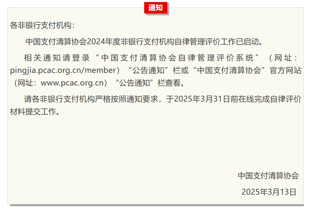 文章來源:四九八網(wǎng)絡(luò)發(fā)布時(shí)間:2025-03-24 13:32:32熱度:410近日,中國支付清算協(xié)會(huì)發(fā)布《關(guān)于組織開展2024年度非銀行支付機(jī)構(gòu)自律管理評(píng)價(jià)的通知》。中國支付清算協(xié)會(huì)2024年度非銀行支付機(jī)構(gòu)自律管理評(píng)價(jià)工作已啟動(dòng)。各非銀行支付機(jī)構(gòu)需嚴(yán)格按照通知要求,于2025年3月31日在線完成自律評(píng)價(jià)材料提交工作。