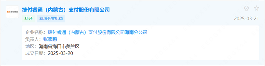 文章來源:四九八網(wǎng)絡(luò)發(fā)布時(shí)間:2025-03-27 09:07:02熱度:413近日,捷付睿通(內(nèi)蒙古)支付股份有限公司(簡(jiǎn)稱“捷付睿通”)近日再新增一家分支機(jī)構(gòu)——捷付睿通海南分公司。該分支機(jī)構(gòu)成立于2025年3月20日,負(fù)責(zé)人為張家鵬。