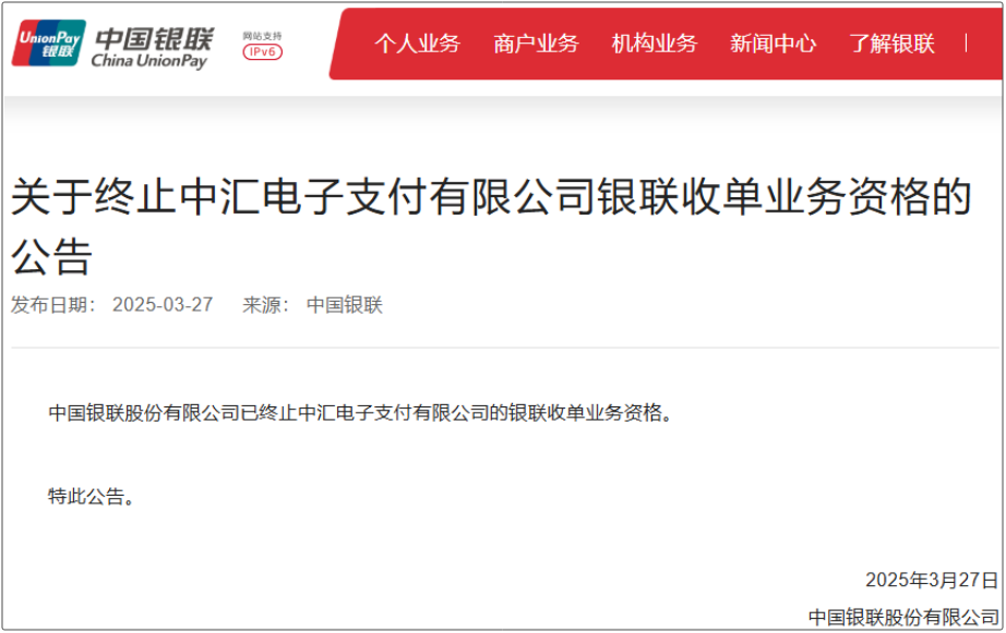 文章來(lái)源:四九八網(wǎng)絡(luò)發(fā)布時(shí)間:2025-04-08 08:49:15熱度:3233月27日,中國(guó)銀聯(lián)官網(wǎng)對(duì)外發(fā)布《關(guān)于終止中匯電子支付有限公司銀聯(lián)收單業(yè)務(wù)資格的公告》。