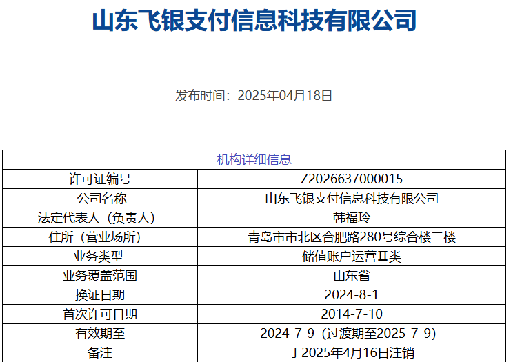 文章來源:四九八網(wǎng)絡發(fā)布時間:2025-04-25 08:59:06熱度:295近日,央行官網(wǎng)更新了已注銷許可機構(gòu)名單,又有一張支付牌照被注銷,山東飛銀支付信息科技有限公司的支付牌照被正式注銷,成為第101張被注銷的支付牌照。
