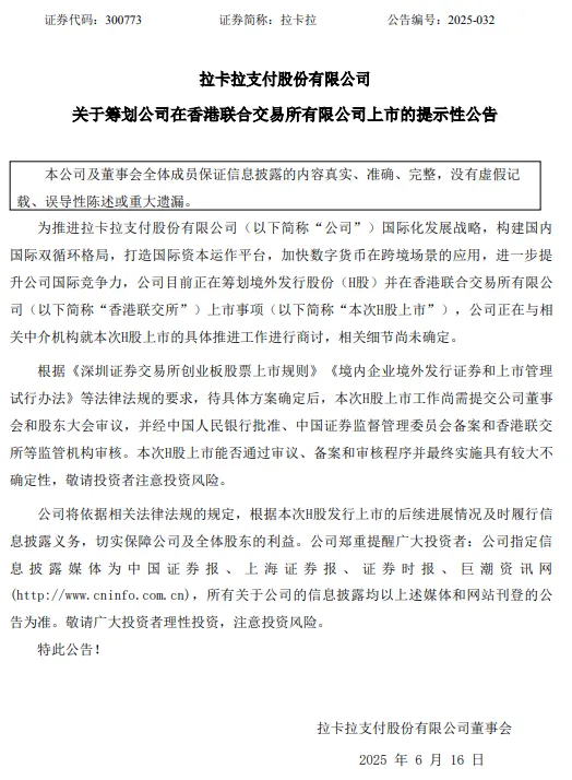文章來(lái)源:四九八網(wǎng)絡(luò)發(fā)布時(shí)間:2025-06-20 08:52:32熱度:3286月16日晚,拉卡拉(300773)發(fā)布公告稱,公司目前正在籌劃境外發(fā)行股份(H股)并在香港聯(lián)合交易所有限公司上市事項(xiàng),并正在與相關(guān)中介機(jī)構(gòu)就本次H股上市的具體推進(jìn)工作進(jìn)行商討,相關(guān)細(xì)節(jié)尚未確定。