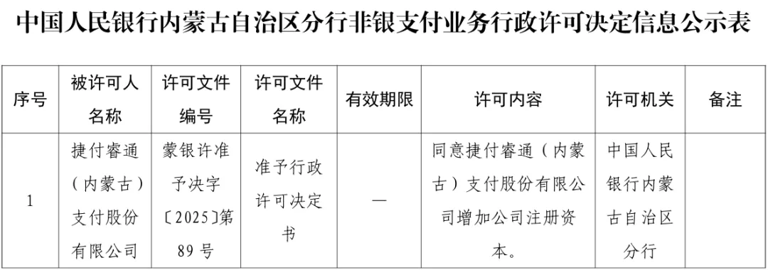 文章來源:四九八網(wǎng)絡發(fā)布時間:2025-07-07 10:29:11熱度:227中國人民銀行內(nèi)蒙古自治區(qū)分行非銀支付業(yè)務行政許可決定信息公示表(2025年6月27日)顯示,中國人民銀行內(nèi)蒙古自治區(qū)分行同意捷付睿通(內(nèi)蒙古)支付股份有限公司(下稱“捷付睿通”)增加公司注冊資本。公開資料顯示,目前其注冊資本為1億元。