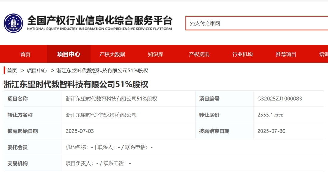 項(xiàng)目信息顯示,該筆轉(zhuǎn)讓交易已于6月5日獲得東陽市人民政府國有資產(chǎn)監(jiān)督管理辦公室批復(fù)。此次交易,披露起始日期為2025年7月3日,披露結(jié)束日期為2025年7月30日。競(jìng)價(jià)方式為網(wǎng)絡(luò)競(jìng)價(jià)。東望數(shù)智旗下運(yùn)營支付品牌“東付通”。