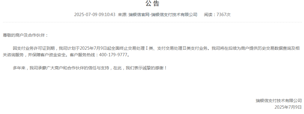 文章來源:四九八網(wǎng)絡發(fā)布時間:2025-07-17 09:24:27熱度:3017月9日,瑞銀信支付技術有限公司(下稱“瑞銀信”)發(fā)布公告,因支付業(yè)務許可證到期,我司計劃于2025年7月9日起全面終止交易處理Ⅰ類、支付交易處理Ⅱ類支付業(yè)務。我司將在后續(xù)為商戶提供歷史交易數(shù)據(jù)查詢及相關咨詢服務,并保障客戶資金安全。
