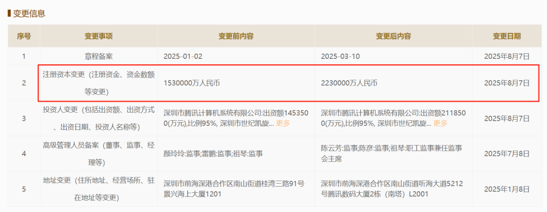 文章來源:四九八網(wǎng)絡(luò)發(fā)布時(shí)間:2025-08-12 09:09:33熱度:261據(jù)國家企業(yè)信用信息公示系統(tǒng)顯示,財(cái)付通支付科技有限公司于2025年8月7日完成注冊資本變更,從153億元增至223億元,增幅達(dá)45.75%。