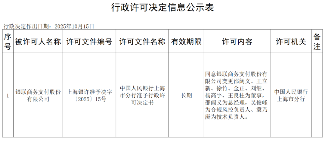 中國(guó)人民銀行上海市分行更新行政許可決定信息公示表,許可文件編號(hào)“上海銀許準(zhǔn)予決字 〔2025〕15號(hào)”顯示,同意銀聯(lián)商務(wù)支付股份有限公司變更邵闊義、王立新、徐竹、金正、劉繼、楊高宇、王良柱為董事,邵闊義為總經(jīng)理,吳俊峰為合規(guī)風(fēng)控負(fù)責(zé)人、冀乃庚為技術(shù)負(fù)責(zé)人。