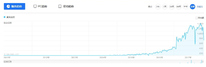 我們先來看下聚合支付的百度指數(shù)(百度指數(shù)不懂的可以百度下),在2017年前是幾乎是個空白,也就是這個時候聚合支付才起步,而且聚合指數(shù)的越來越高,意思就是互聯(lián)網(wǎng)對聚合指數(shù)的關(guān)注的人越來越多,說明從整體來看這個行業(yè)在一個向上增長的趨勢。